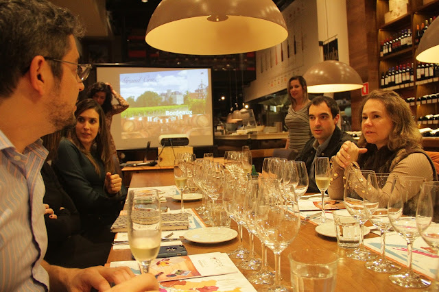 O curso foi ministrado pela querida sommelière francesa Amandine Castillon, uma fofa que sabe tudo sobre vinhos, especialmente os franceses. Ela nos contou tudo sobre Bordeaux. Clima, Terroir, solos, cepas, cortes, as regiões dentro de Bordeaux, etc. Foi demais aprender sobre esses vinhos que estão na minha lista pessoal dos favoritos (aliás, vários vinhos franceses estão na minha lista, incluindo alguns de Bordeaux).
