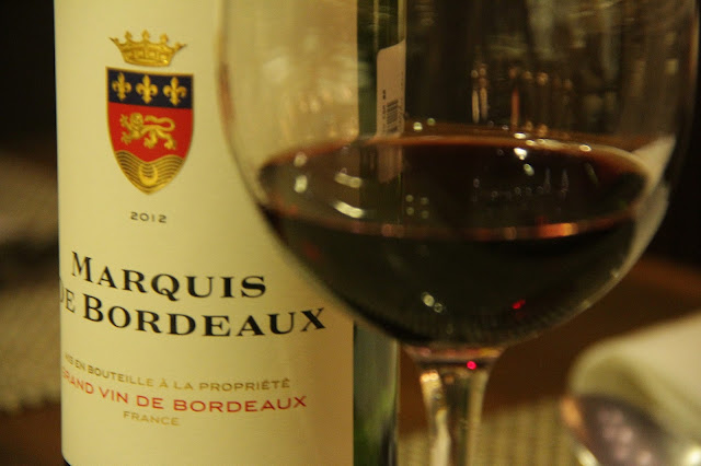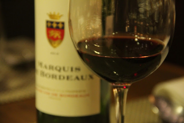Mas vamos ao que interessa! Comidinhas, bebidinhas, coisinhas para nos deixar felizes e de estômago contente também. Para regar o jantar, o escolhido foi um vinho francês chamado Marquis de Bordeaux. Um vinho que custa na faixa de R$100,00 e é um belo exemplar da região mais importante de produção de vinhos no mundo, Bordeaux, na França. O custo benefício desse vinho é muito bom, pois podemos provar um vinho dessa região tão nobre por um preço acessível.