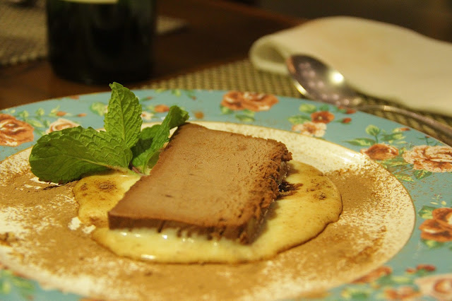 De sobremesa, rolou um pudim de ganache de chocolate com creme inglês. Para, né?! Estava tão bom, que dava vontade de passar o dedo no prato para comer o que a colher não conseguia pegar.