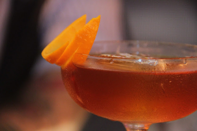 O Bartender da casa, Leonardo Massoni, criou dois drinks. Ele, além de simpático, é super criativo. Adorei os drinks dele também. O primeiro que eu provei, foi uma releitura do clássico Manhattan, que se chamou “O Velho João” (alusão ao Johnny? hahaha), que levava o Gold Label, vermute tinto, chartreause verde (calma, também perguntei o que era e é um tipo de licor, não um alienígena), St. Germain e foi aromatizado com laranja bahia. É aquele drink forte, feito para as mocinhas duras na queda (o/ tamo junto, meninas). Gostei bastante, lembra o Manhattan, mas tem sua própria personalidade. Adorei!