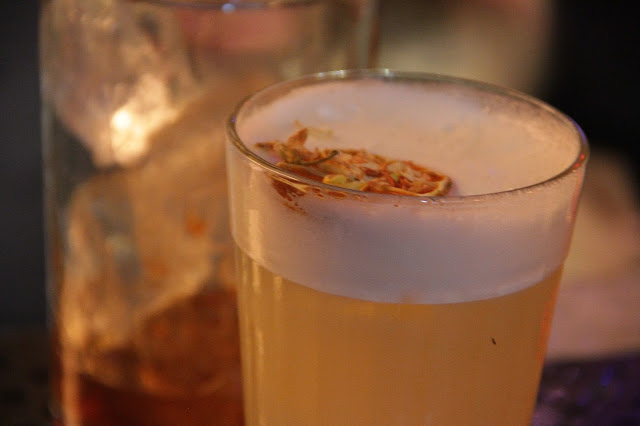 O outro drink que ele criou, tinha a apresentação parecida com o drink da Stephanie, mas era bem diferente. Se chamava “Dusk Gold Fizz”, bem leve e refrescante, levava Gold Label, limão siciliano, chá de jasmin, clara de ovo e água gaseificada. Esse era puro jasmin, tanto no nariz quanto na boca. Uma delícia!