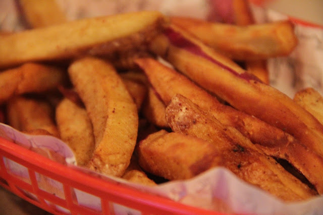 Eles possuem o Onion Rings de entrada. Que são anéis gigantes de batata, empanados e fritos. Super combina com o ketchup rústico deles, mas a maionese da casa acompanha essa entradinha. Também provei as batatas. Tem a opção de misturar batata doce com batata normal. Eu optei por essa e adorei. Gosto dessa mistura, mas confesso que minjas favoritas ainda são as batatas normais com bastante sal.