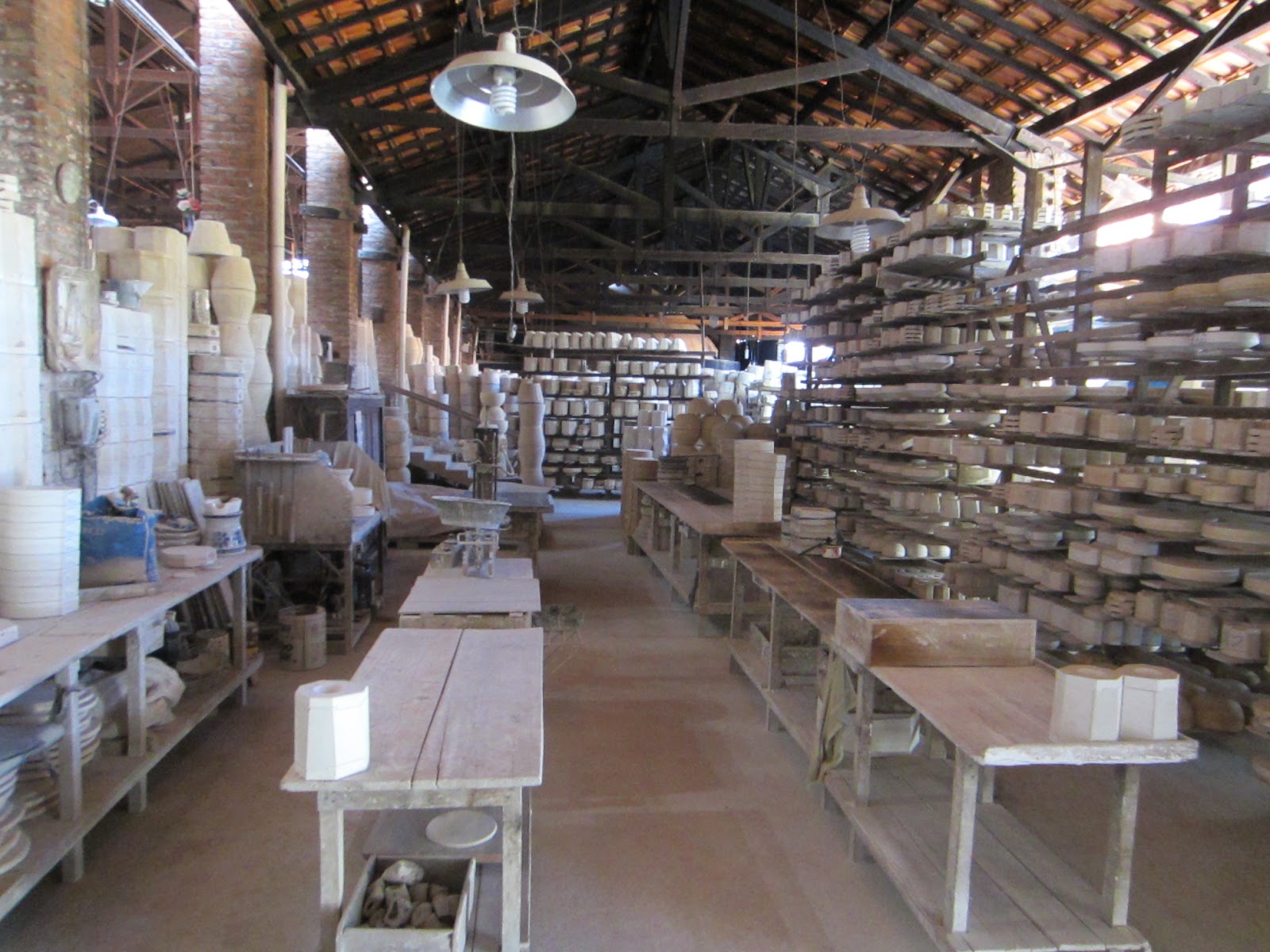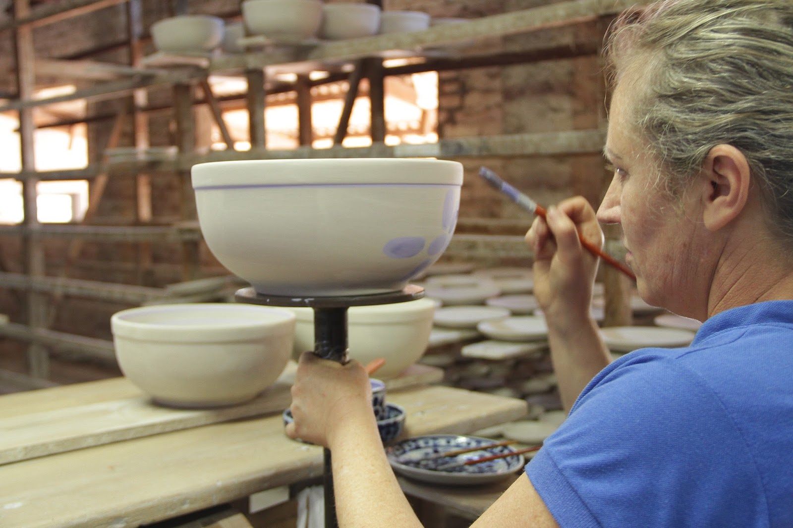Depois disso, a peça sai crua, sem acabamento e vai passar por um processo longo de secagem, pois a secagem se dá ao natural. Depois de um tempo, eles conseguem fazer o acabamento e a peça continua secando. Quando estiver pronta, ela vai para o processo de pintura. Primeiro eles pintam manualmente (sim, eles pintam peça por peça manualmente, incrível) com aquela tinta azul (mas eles também possuem outras duas cores, verde e marrom) e depois, se passa o verniz.