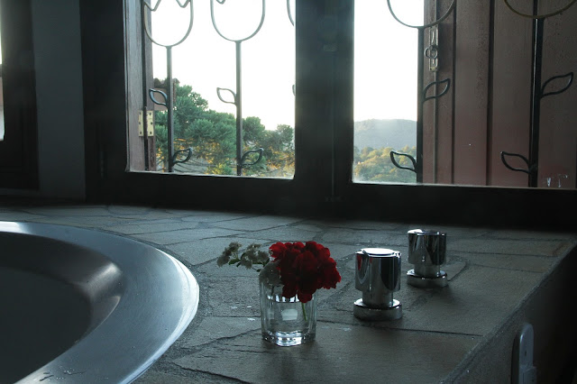 O quarto que eu fiquei hospedada era bem grande, com cama fofinha, varanda para o jardim (aahh, um suspiro escapa quando me lembro do jardim desse hotel, já conto) e uma jacuzzi linda de frente para janelas de madeira, com vista para as montanhas. Além de todas as velinhas que estavam ali em volta da jacuzzi, vasos de flores ajudavam na decoração. Aliás, flores frescas não faltam na Morada das Nuvens.