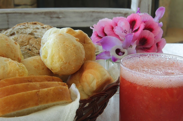 Não é demais? Eu pedi suco de morango (meu suco favorito, da minha fruta favorita) e eles me trouxeram copos de suco de morango fresco, que eles haviam acabado de bater. Tinha pedaços de fruta mesmo, não era nada de polpa. Fiquei louca! Os pães artesanais que eles preparam, geleias que eles preparam. Até crepes que eles podem fazer na hora para você e ele vem quentinho, do sabor que você desejar. Eu fiquei encantada com esse cuidado.