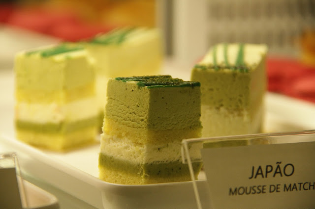 Japão: um delicado mousse de matcha, chá verde, intercalado com pão de ló de laranja, amêndoas e cointreau. Além de lindo, muito saboroso.