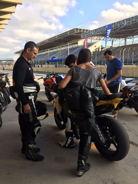 Colocaram toda aquela roupa bacana em mim (obviamente, ficou gigante e cabiam duas Talitas lá dentro, mas funcionou), bota, capacete e luva. Tudo necessário para a proteção e segurança. Aí o Leandro me explicou tudo que precisava fazer, como eu deveria agir. Evitar cair em cima dele nas frenagens (trabalho para meus braços super fortes, só que não hahaha), cair para os lados quando ele fosse encostar o joelho no chão (ai meu deus, já fiquei bem apavorada, mas mantive a pose), não soltar do guidão (a moto é feita para levar pessoas na garupa, então tem um guidão especial para o passageiro segurar bem) e avisar caso esteja com algum problema. Entendi tudo e rezei para fazer tudo certo. Fiquei com medo de fazer qualquer Talitice que eu sempre acabo fazendo e ferrar tudo.
