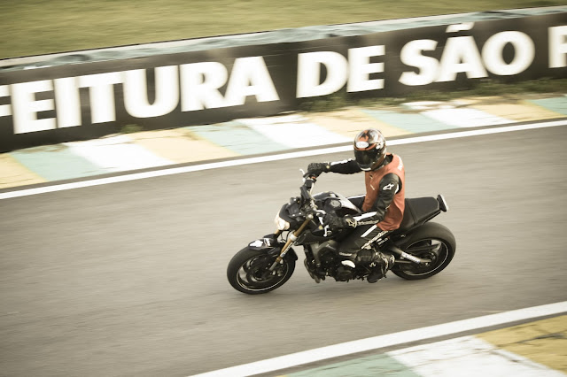 Eu já tinha andado em Interlagos, mas de carro. Nada se compara! Moto libera muito mais adrenalina no nosso corpo! Eu não lembro da velocidade que atingi com os carros que andei por lá, mas com certeza não foi nada acima de 260km/h, velocidade que o piloto Leandro Mello (@piloto_leandromello) atingiu com a bandida. Aliás, o Leandro é piloto profissional, já participou de dezenas de competições, categorias, matérias para Auto Esporte da Globo, revistas de motos, etc.