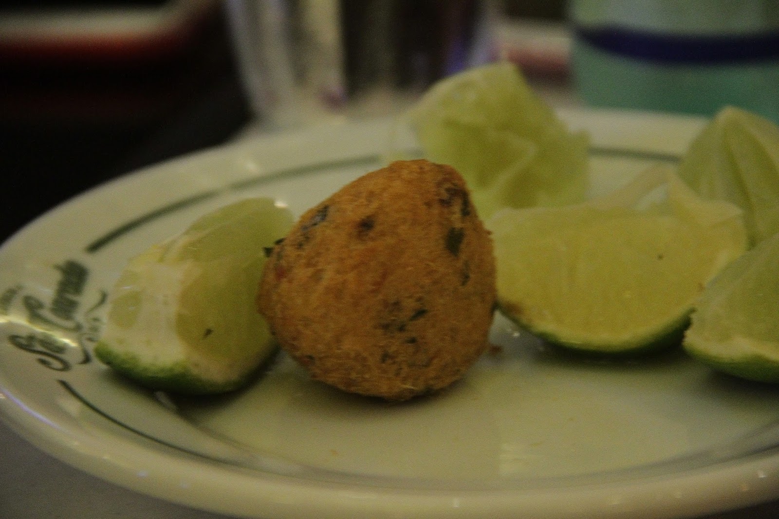 A parte dos petiscos, comecei com bolinhos de bacalhau. Confesso que sou bem chata para esses bolinhos, porque é difícil achar o equilíbrio entre todos os ingredientes. Esse estava bom de verdade. dava para sentir o gosto do peixe e da batata. Super! Com um Tabasco então, super de novo! Eu adorei.