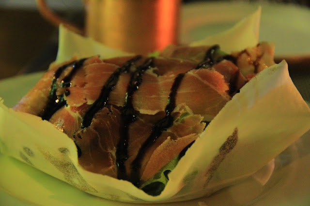 De entrada, não sei o que seria melhor para indicar. Os mini hambúrgueres são ótimos para compartilhar com os amigos. Os bolinhos de carne também e são super saborosos. Mas para aquele sai, decidi provar a salada de parma com figo (que bem servida com um mix de folhas verdes, ricota e é servida numa cestinha crocante). Também escolhi o mix de canapés, que vem dois sabores. Um de salmão marinado e creme azedo e o outro de parma, queijo de cabra e cebola caramelizada.
