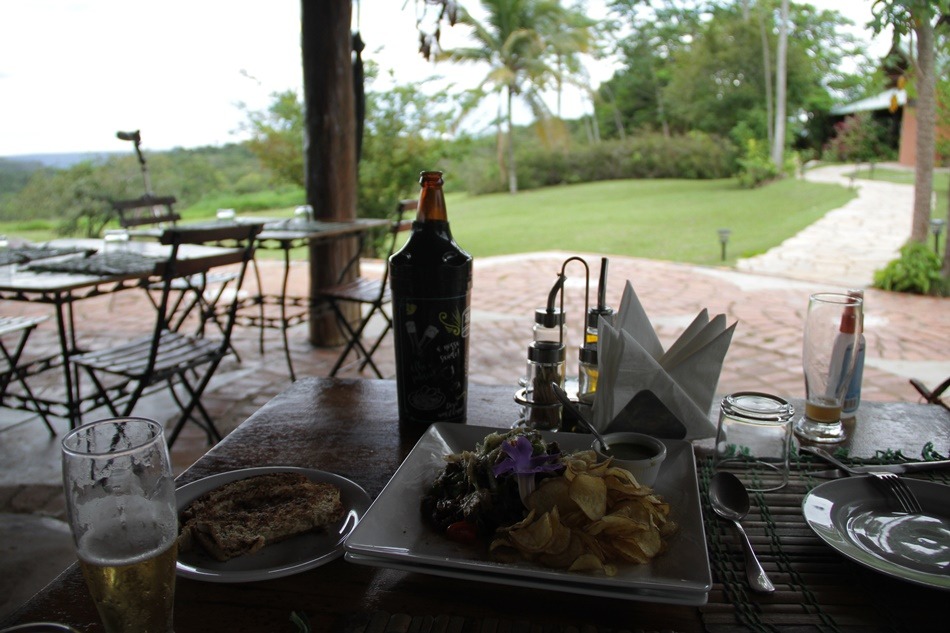 Ela é bem exclusiva e possui cerca de 9 quartos, cada um de um jeito, com uma comodidade. Tem quartos menores, quartos mais espaçosos. Depende do que você está procurando. Tem uma piscina para aproveitar o tempo que quiser (como lá faz calor quase que o ano todo, tem piscina o ano todo também), tem vista perfeita para vários paredões da Chapada dos Guimarães e tem também um restaurante delicioso com uma comidinha deliciosa. Uma adega pequena, com rótulos básicos, vários rótulos de cervejas (algumas artesanais bem saborosas) e muitos drinks. Nosso ritual após os passeios era ficar de bobeira descansando admirando as paisagens, escutando os pássaros e bebendo drinks e cervejas. Na maior parte das noites que ficamos por lá, optamos também por jantar lá. Cada dia escolhemos um prato diferente e estava delicioso. Passamos também a virada do ano na pousada e foi demais. Subimos ao mirante que tem vista 360º e pudemos ver a queima de fogos de vários pontos, incluindo Cuiabá.
