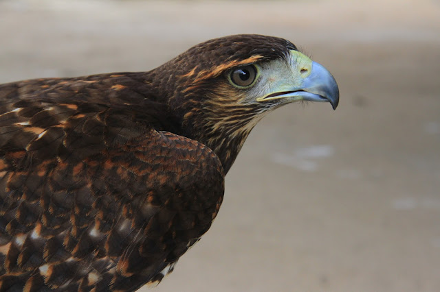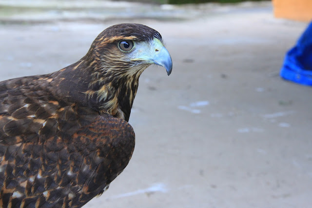 Eles trazem pedaços de carnes diversas que eles se alimentam e aí a brincadeira começa. As aves voam longas distâncias e param em nossa mão (obviamente protegida por luvas grossas de couro, pois as unhas das aves são afiadas e eles possuem uma força absurda nas garras).
