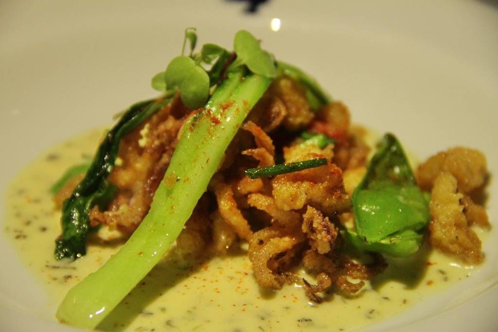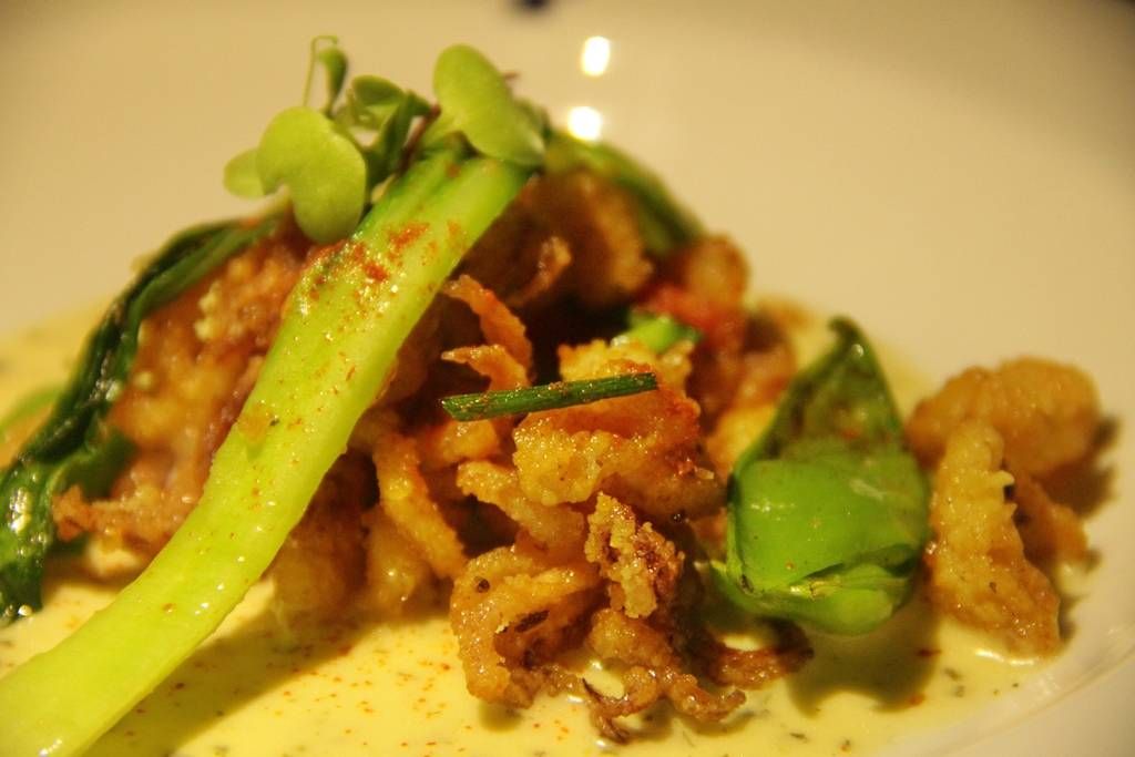 Bom, já falei demais. Vou contar sobre os pratos que provamos e suas harmonizações. Preparados? O primeiro prato foi servido com lulas crocantes, tomate confitado e ervilhas tortas. A harmonização desse prato foi feita com um vinho branco chamado Claude Val. Não sei vocês, mas muita gente não curte outro vinho sem ser o tinto. Eu gosto de todos, inclusive do branco. Esse estava perfeito com a lula. Que combinação perfeita.
