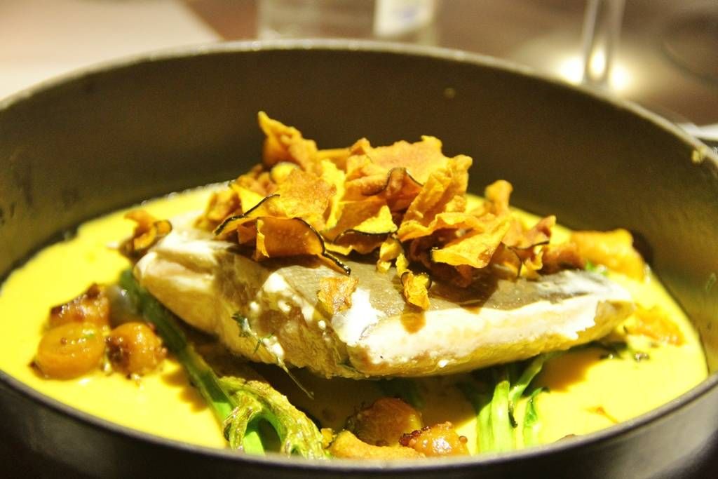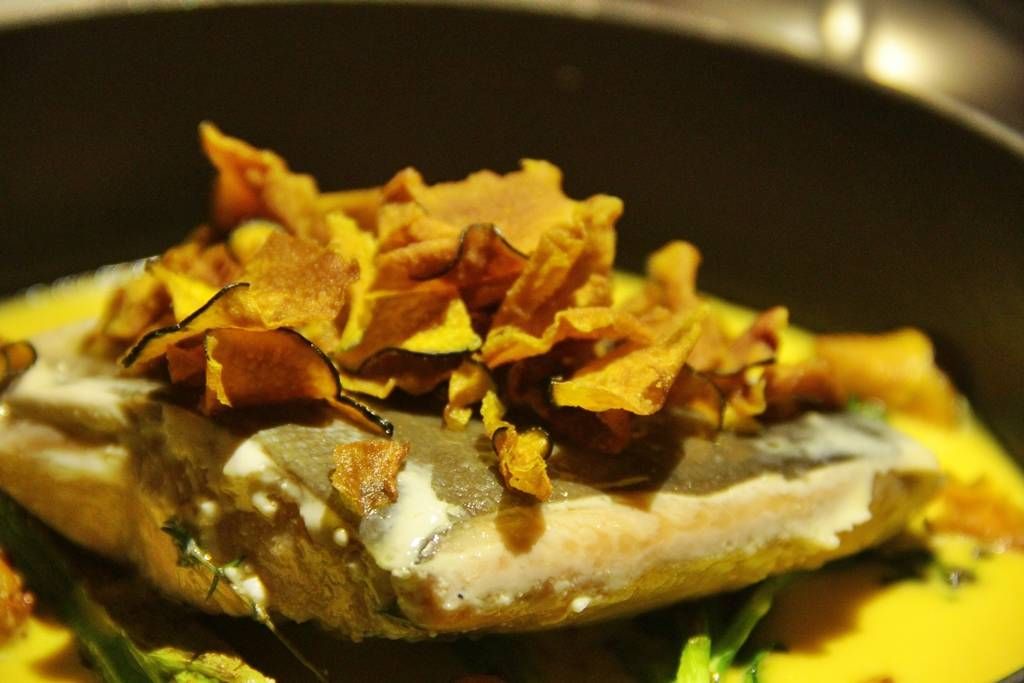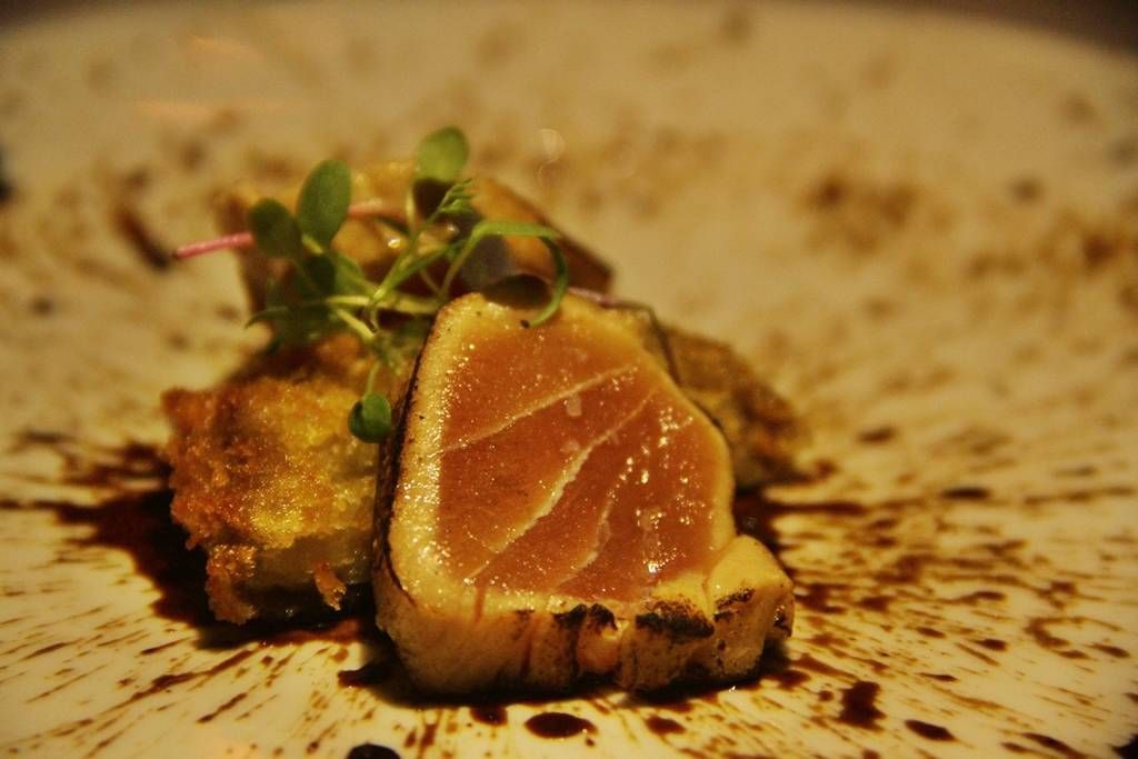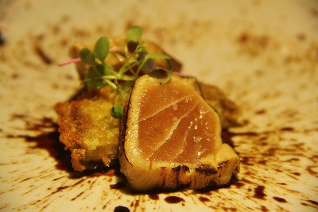 Depois foi a vez de provarmos um prato com atum. Era atum com foie gras (eu não gosto então pedi sem), ambos selados com o maçarico, shitake panco (isso mesmo, lembra um pão e é fofo, pode lembrar da marca Panco de pães e bolos sim porque faz todo o sentido) e um jus de balsâmico para deixar tudo temperadinho e meio azedinho. Para harmonizar com esse atum (que estava simplesmente fantástico, saboroso e todos os sabores do prato combinando), eles nos serviram uma taça de Domaine François Labet, um vinho francês da uva Pinot Noir. Vocês também amam Pinot Noir com atum? Eu acho maravilhoso.