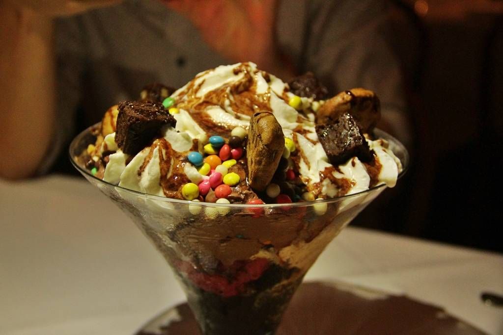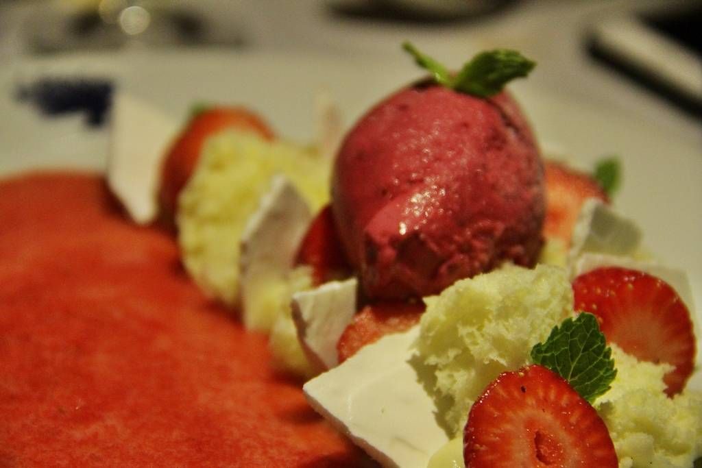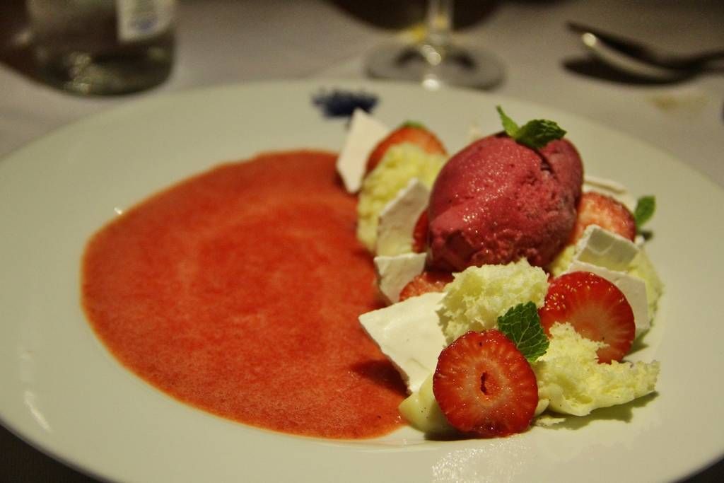 A sobremesa oficial do evento, era essa taça enorme que está na foto aí embaixo. Merengue, chocolate, chantilly, suspiro, etc. Mas como eu estava na promessa ainda, não comi porque tinha chocolate. Então eles me enviaram outra sobremesa, que tinha uma calda de morango, sorbet de morango e pedaços de bolo branco no meio de lascas de suspiro. Uma delícia. Para lamber os lábios de tanto comer.