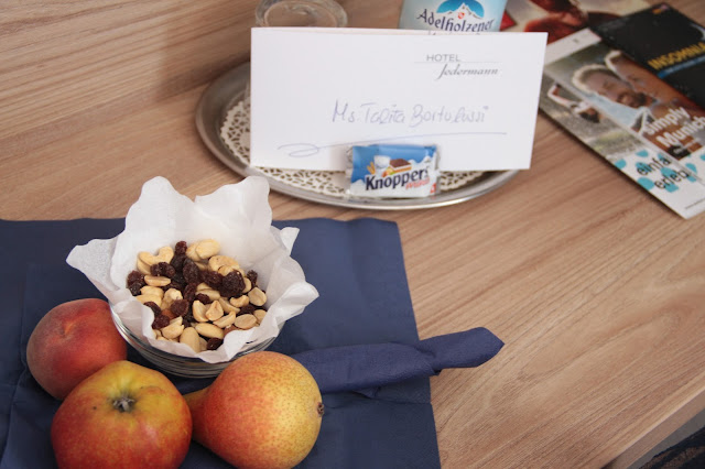 Eu já gostei da recepção. Quando cheguei, eles estavam super me esperando e quando entrei no quarto tinha uma cartinha escrita à mão para mim, com frutinhas secas, frescas e muita água mineral para tomar. Eu estava vindo de uma longa viagem saindo de Vienna, então tudo isso veio em boa hora.