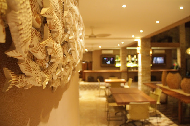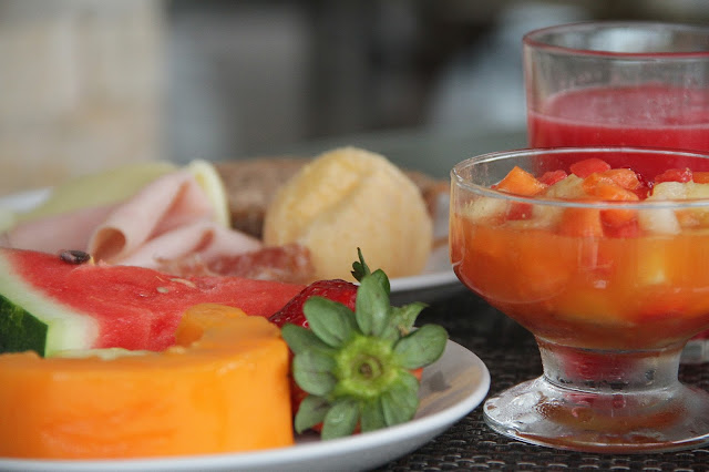 Antes de ir aos quartos, quero contar sobre o café da manhã. Ele é servido no restaurante do hotel, que tem um visual bem bonito, com uma decoração praiana, porém elegante. Temos frutas, tapioca, frios, pães caseiros, sucos de diversas frutas, ovos mexidos, etc… etc. Passar fome está totalmente fora dos planos quando se está hospedado no Real Villa Bella. Come-se muuuuito bem por lá, desde cedo. Ah! Esqueci de mencionar os doces… Bolos, tortas e outras delícias que o pessoal da cozinha prepara com tanto carinho, que fica difícil não aumentar o índice glicêmico logo cedo (hahahaha aumento sempre e adoro).