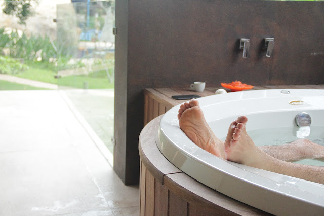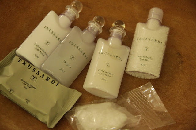 A cama era enorme, linda e macia. Não dava vontade de sair de lá em nenhum momento. Mas saímos, para ir pra jacuzzi da varanda (hahahaha). Os amenites do hotel são todos da Trussardi (=O eu de boca aberta de novo) e tinha sais de banho também. Aquela jacuzzi era uma delícia e se fosse possível, iríamos passar o dia todo lá e talvez, até a noite toda (nem conto que entramos lá mais de 1 hora da manhã para curtir uma hidro e ver a lua que estava cheia). Foi maravilhoso.
