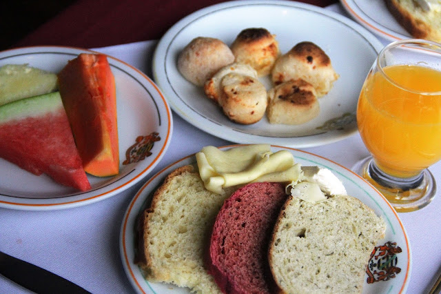 Depois de acordar e criar coragem para sair da cama, era a hora do espetáculo do dia, o café da manhã =D! Além dos pães de queijo, eles também fazem vários pães de vários sabores, de maneira artesanal. Pão de ervas, de beterrada, mandioquinha, etc. Tudo fresquinho e muito saboroso, com gostinho de comida de interior. Sucos, docinhos típicos da região, frios, frutas e muito mais, para começarmos o dia com o pé direito e estômago feliz.