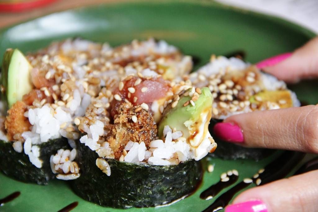 Para escolher o que comer, é fácil. Mas não se esqueça de começar pelas entradinhas. Elas realmente merecem sua atenção. Nós provamos dois pratos para entrada e confesso que são bem servidos. Vá com bastante fome. Começamos com o Musubi de Salmão, que vem com salmão grelhado, arroz frito, talo de cebolinha, sriracha mayo (que um pouco de pimenta), molho teriyaki enrolado na alga nori.