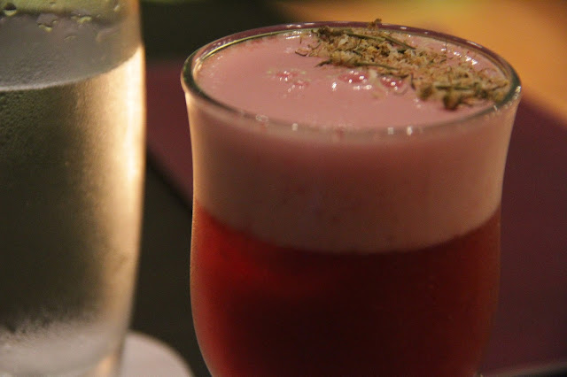 Depois fui para um drink que foi o meu favorito. Além de lindo, esse era cheiroso, pois leva camomila. Se chama Cup of Tea e ele é inteiro surpreendente! Leva gin Tanqueray (o/), redução de amora, orange bitter e uma espuma feita com camomila e geléia de cabernet! Isso mesmo, uma geléia de cabernet! O vinho! Foi um dos melhores drinks da vida e eu ficaria cheirando ele para sempre. Amei!