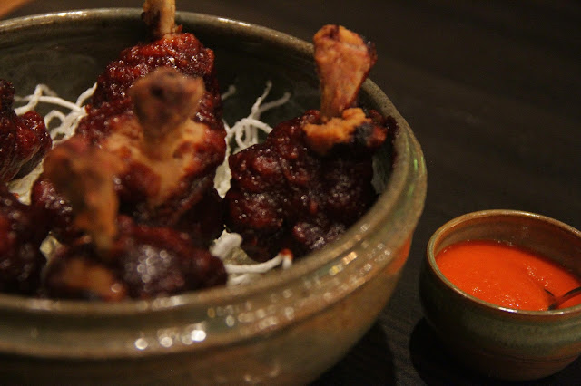 Para harmonizar com os drinks, eles possuem uma carta de pratos bem animadora. Sério. Outra vez tive que me segurar para não provar tudo. Aí entra a questão de que meu estômago não é tão grande assim. Comecei com uma porção de asinhas de frango dos deuses. Não sou muito fã delas e muito menos, fã de comer com as mãos (justamente pelo fato de que eu me sujo toda, meleco a roupa, derrubo e faço uma bagunça na mesa e no prato). Mas, me dei super bem com elas, comi tudinho e estavam maravilhosas! Apimentadas no ponto certo. Outra vez, apresentação impecável.
