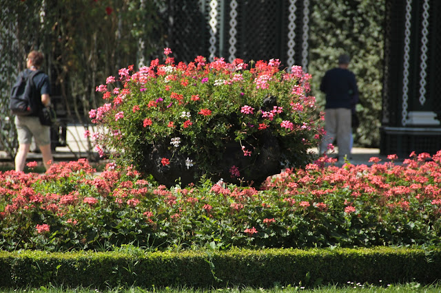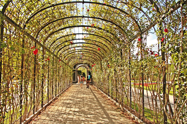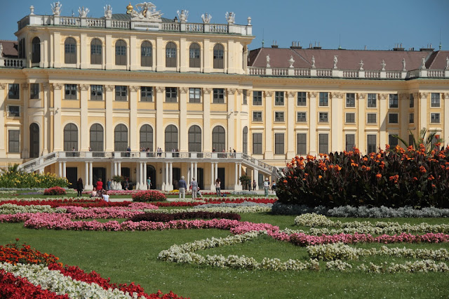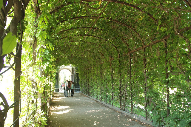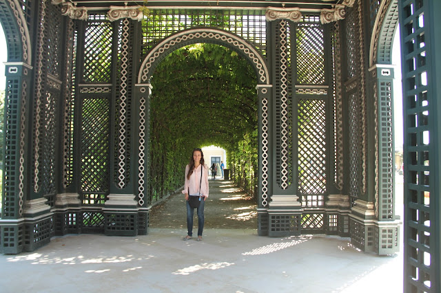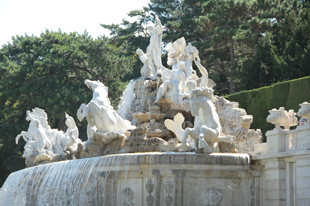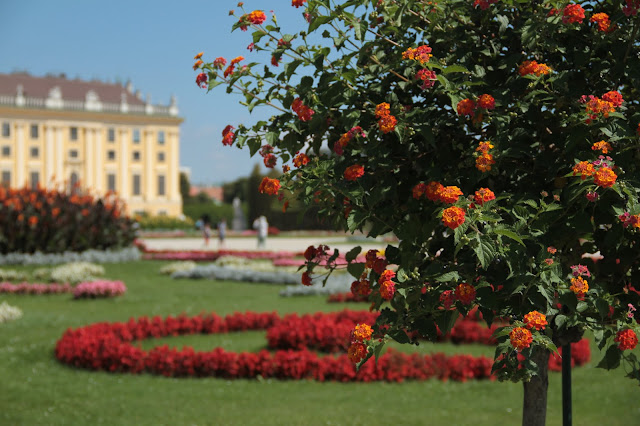 Os jardins… (pausa para um suspiro longo…) São encantadores. Visitei Vienna no verão, portanto estava tudo bem verde e abarrotado de flores coloridas. Borboletas, pássaros, etc. Uma paisagem mais linda que a outra. Você deve passar muito tempo caminhando por lá e admirando tudo. Se tiver sorte e observar bem, vai ver roseiras com o caule bem grosso, que são da época em que Maria Antonieta viveu naquele palácio. Essa mulher causava em qualquer lugar que passava.