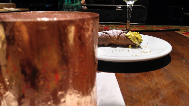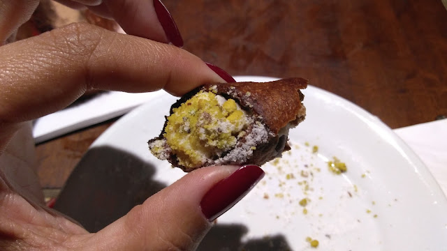 Para finalizar, devorei um belo e tradicionalíssimo Cannoli. Eles sabem como equilibrar todos os sabores e o resultado final, é um suspiro a cada mordida. A massa é feita de chocolate e café (e olha que eu nem curto muito café em nada, mas aqui ficou perfeito). O recheio é feito com ricota fresca (super fresca, derretendo), gotas de chocolate e pistache moído. Enfim… Dos deuses! É uma sobremesa típica da Sicília, que precisa de equilíbrio, senão fica ou sem graça ou muito doce. Esse aqui é excelente!