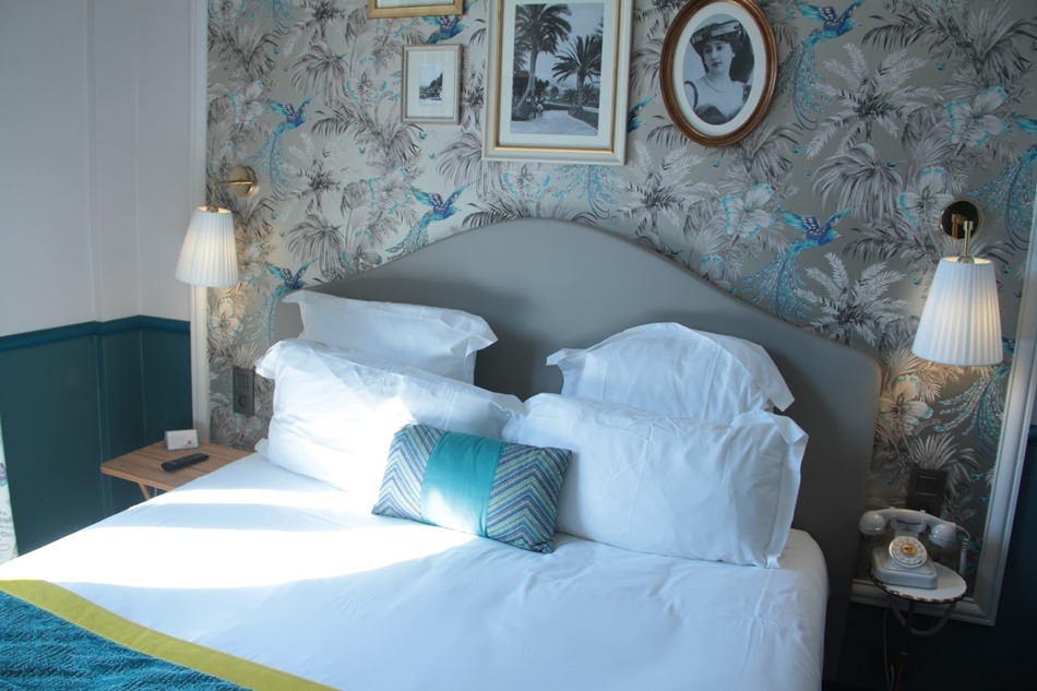 Me hospedei em dois hotéis da cidade, ambos fazem parte da cadeia Happy Culture, que tem diversos hotéis pela França. Primeiro fiquei em um hotel chamado Villa Otero, que fica super perto da estação centra de trem, onde desci. Fui caminhando até lá. Mas fica a alguns quarteirões da praia, é preciso caminhar um pouco. Mas é bem tranquilo e o hotel é ótimo, todo azul! Um quarto mais lindo que o outro e combina com o céu azul de Nice.