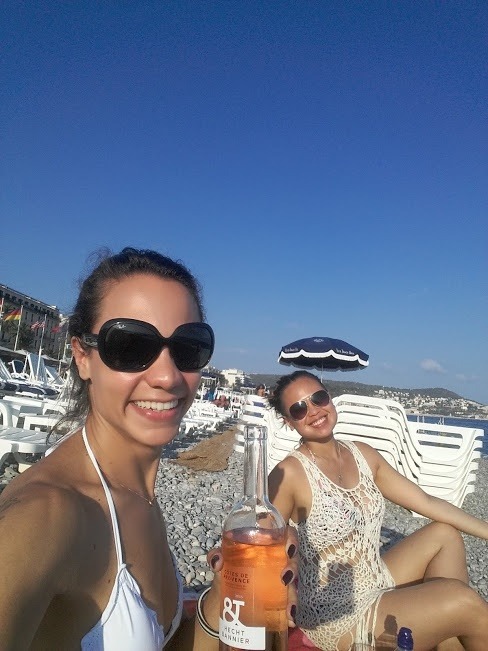 Mas devo confessar que o meu momento favorito do dia era simples e na praia. Passava em algum mercado (tipo Monoprix), comprava uma garrafa de algum vinho rosé da região (nada além de 8 euros e os vinhos eram fantáááásticos, que aqui custam mais de 100 reais), umas frutinhas, uns chocolates, água e ia pra praia, no final do dia, depois de andar pelas outras cidades da Cotê d’Azur. Chegava com a Roscela (a filipina maluca) por volta de umas 16:30 na praia, esticávamos a canga e ficávamos ali, comendo, bebendo (uma garrafa de vinho para cada uma, então imagina), tomando sol, paquerando os mocinhos franceses (affff, um mais lindo que o outro e não tínhamos foco para nada) e esperando pelo belíssimo pôr do sol que Nice nos dava.