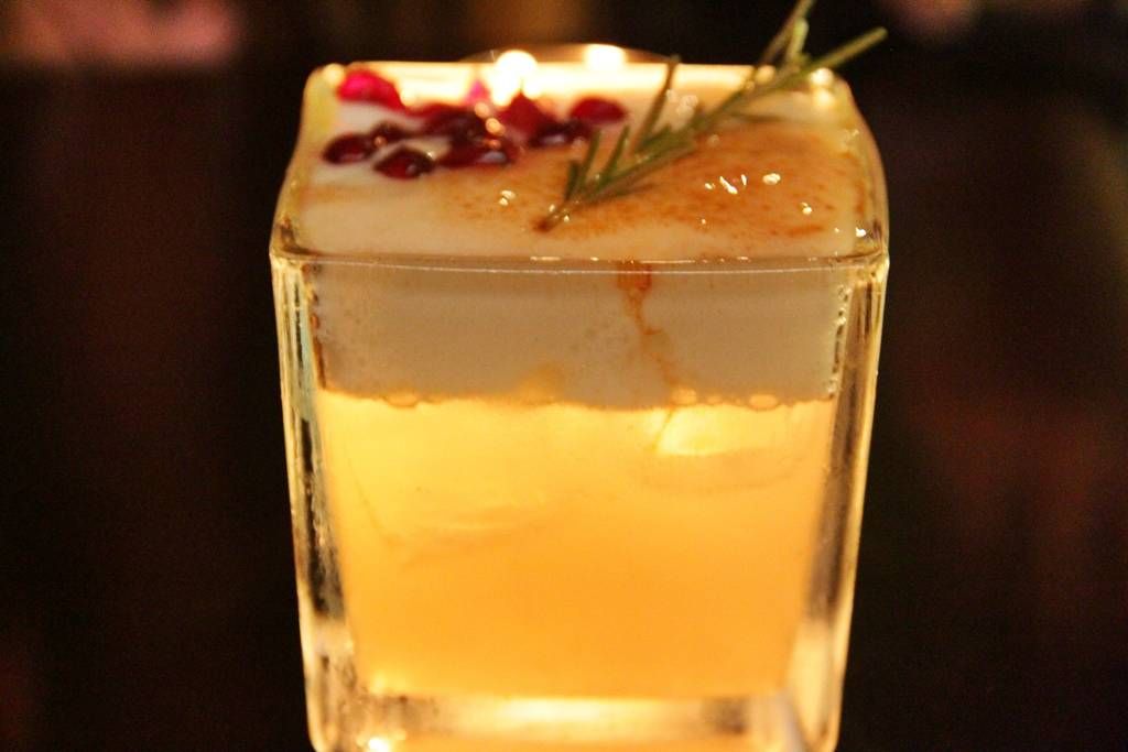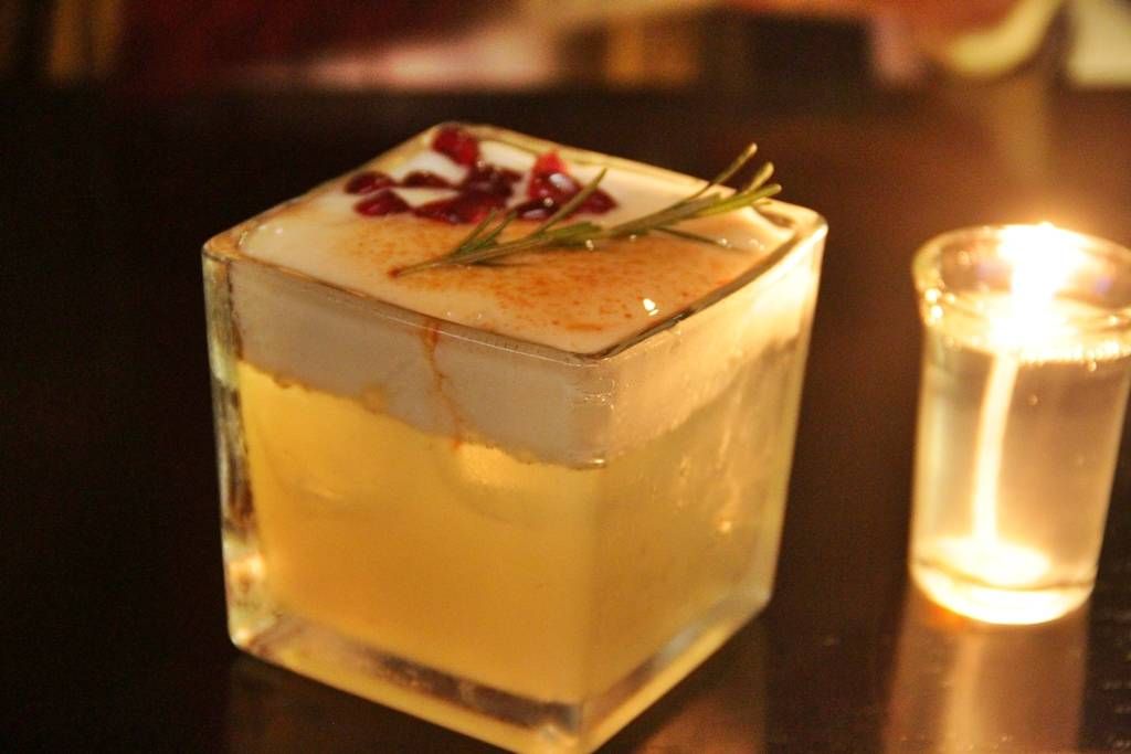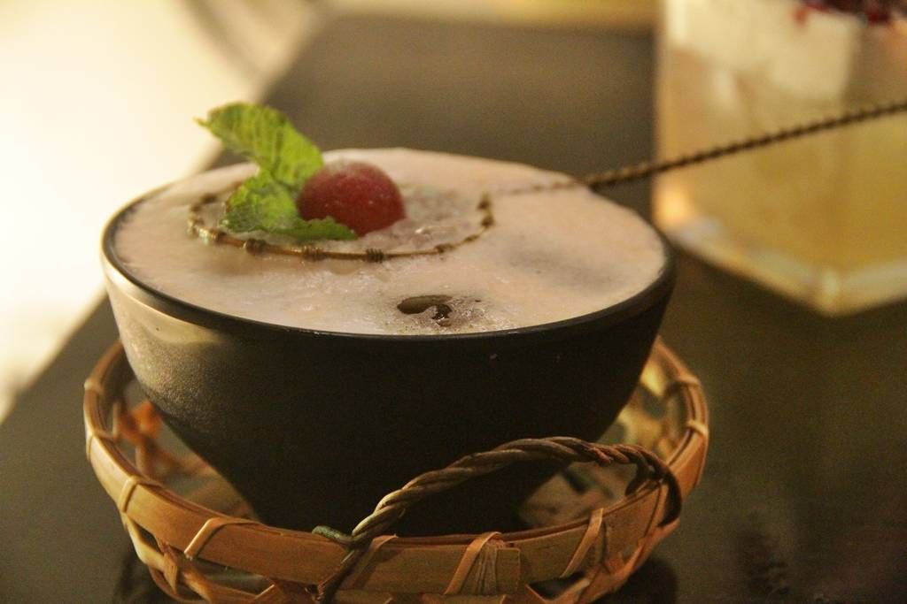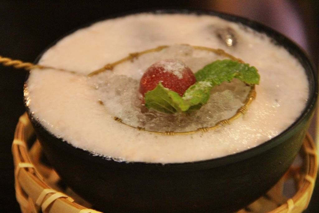 Aí, trouxeram para a gente provar dois drinks autorais da casa que são super diferentes, criativos, lindos e ousados. Um deles se chama Ofurô. Que é feito com gim com infusão chá verde, aperol, suco de pêra com uvas negras, toque de água de flor de laranjeira e limão. Detalhe para a super produção que eles fazem na apresentação do drink, não é?! Olha que lindo!