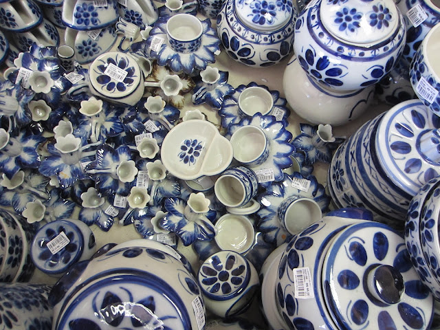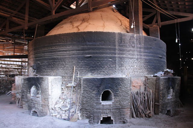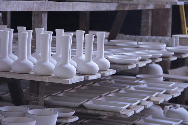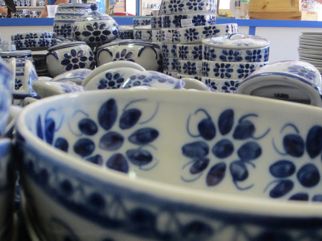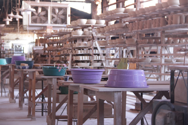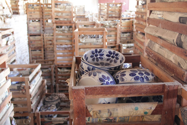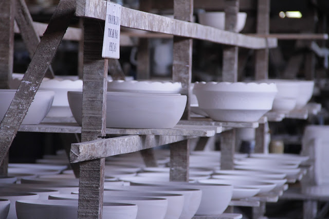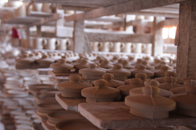 Depois disso, a peça sai crua, sem acabamento e vai passar por um processo longo de secagem, pois a secagem se dá ao natural. Depois de um tempo, eles conseguem fazer o acabamento e a peça continua secando. Quando estiver pronta, ela vai para o processo de pintura. Primeiro eles pintam manualmente (sim, eles pintam peça por peça manualmente, incrível) com aquela tinta azul (mas eles também possuem outras duas cores, verde e marrom) e depois, se passa o verniz.