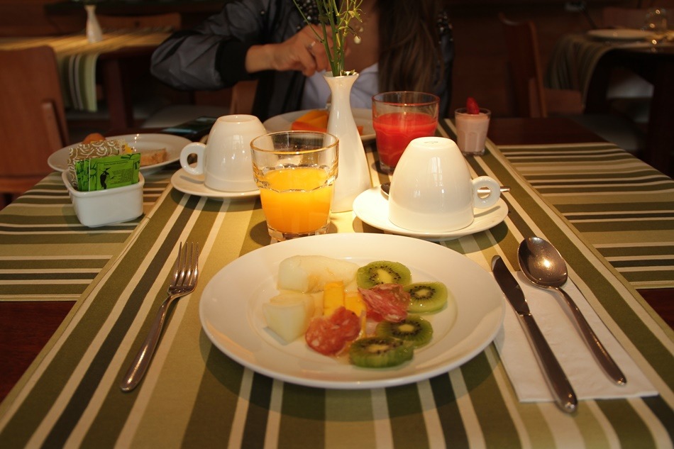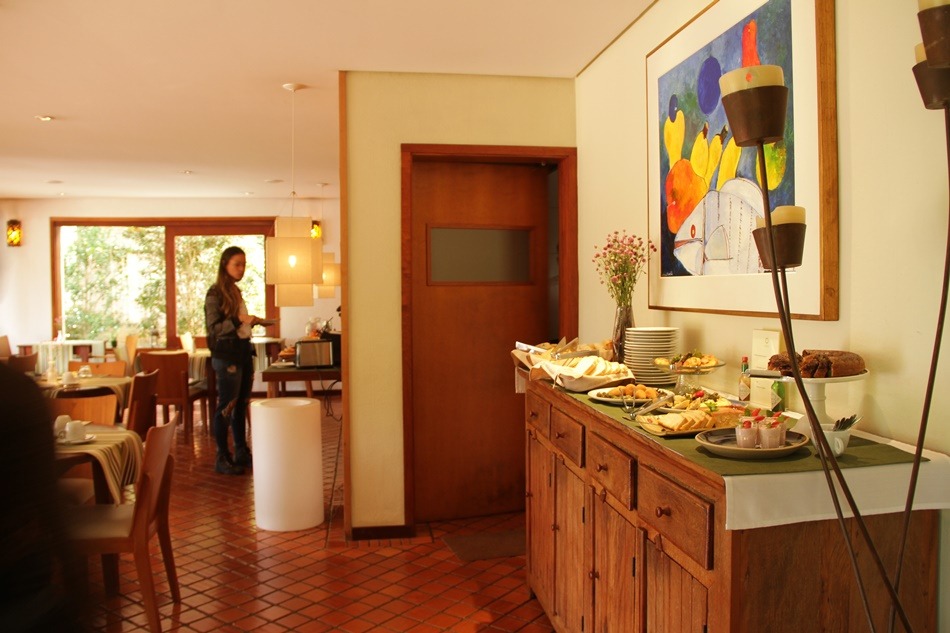A estrutura dos quartos é ótima e seguem a mesmo esquema de excelência da Pousada do Cedro no geral. Como disse sobre os quartos, se aplica ao resto, que são os detalhes muito bem pensados e como podemos sentir esse cuidado em criar uma atmosfera de conforto para encantar os hóspedes. Ao caminharmos pelos ambientes da pousada, externos ou internos, podemos ver isso nitidamente. A área onde o café da manhã é servido, foi dividida em duas partes. A parte de dentro, onde o hóspede pode tomar café sem se preocupar com mais nada, e a parte de fora que fica embaixo de um pergolado lindo, todo cheio de plantas e flores se enrolando nele. É para nos avisar que nosso dia está começando com o pé direito (hehehehe). Nas opções, tudo que precisamos. Frutas frescas, pães feitos lá (nossa, como estavam ótimos), sucos, frios, opções quentes e mais, muito mais.