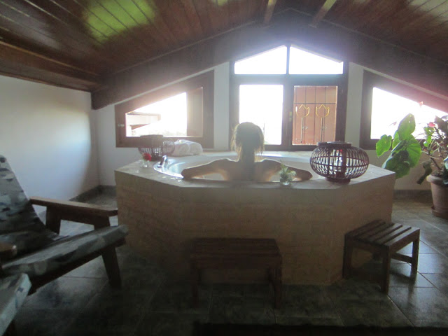 O quarto que eu fiquei hospedada era bem grande, com cama fofinha, varanda para o jardim (aahh, um suspiro escapa quando me lembro do jardim desse hotel, já conto) e uma jacuzzi linda de frente para janelas de madeira, com vista para as montanhas. Além de todas as velinhas que estavam ali em volta da jacuzzi, vasos de flores ajudavam na decoração. Aliás, flores frescas não faltam na Morada das Nuvens.