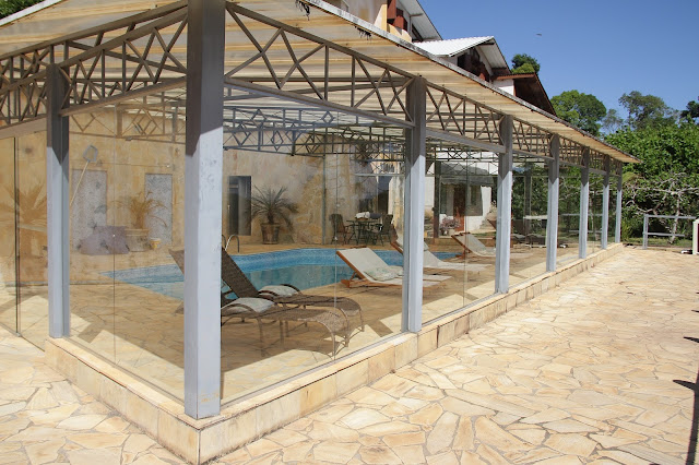 A pousada tem toda a estrutura para casais que querem curtir o clima de romance da serra, com muitas flores e até mesinhas para a gente sentar e tomar uma xícara de chá quentinho. Mas também existe uma piscina linda, com vista para serra também e várias cadeiras para a gente deitar e tomar sol. A piscina não é aquecida, mas é climatizada, o que já ajuda bastante no quesito frio.