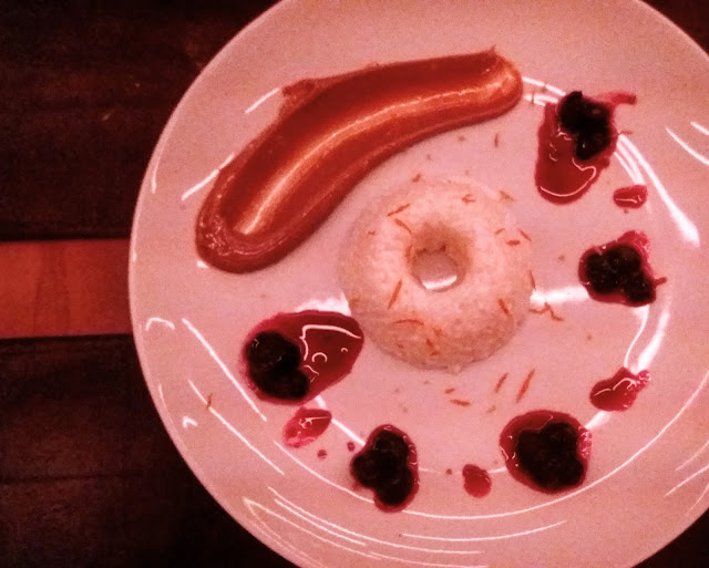 Para sobremesa, pedi um manjar de tapioca com leite condensado cozido e jabuticabas reduzidas com calda doce. Estava muito bom, o melhor prato do jantar, de longe. Porém a apresentação estava péssima. O manjar estava bom, porém ficava melhor misturando com a jabuticaba ou com o leite condensado.
