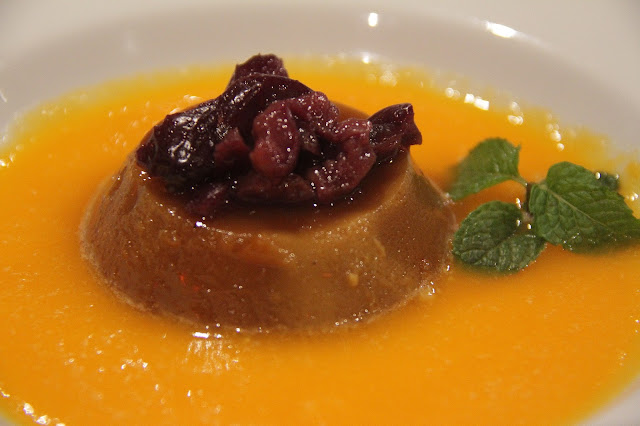 Sobremesa: Pudim de ovos com pimenta Jamaica, caramelo e vinho do porto, com calda de cenoura, maracujá e laranja. Em cima, azeitona preta doce. Demais!