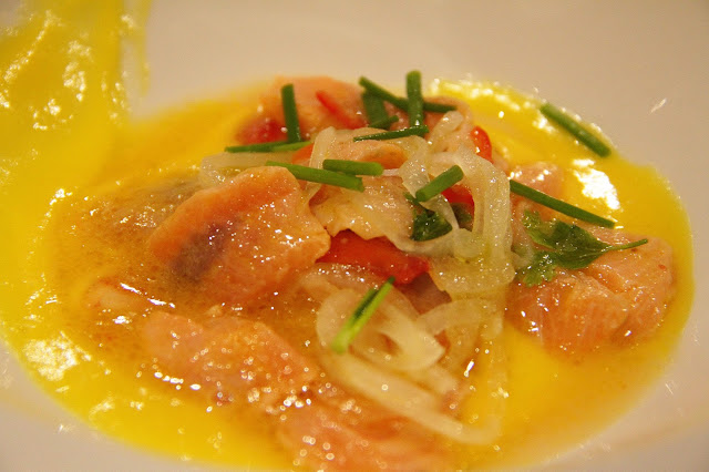 Entrada 2: Truta marinada com limão, coentro, cebolinha, cebola, purê de mandioquinha e pedaços de morango.