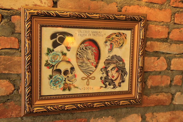 Como todo bom estúdio de tatuagem e piercing, a trilha sonora é sempre o bom e velho rock ‘n roll, o que me faz me sentir em casa, claro. Eu até brinquei dizendo que estava doendo menos só por eu estar escutando The Doors (a voz do Jim Morrison faz com que meu corpo libere muita endorfina e serotonina <3). Tem uma geladeira lá, cheia de cerveja para quem quiser beber enquanto espera ou enquanto faz a tatuagem. O sofá do hall de entrada é super confortável, o que torna a espera pelo desenho mais agradável.