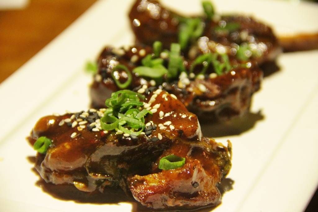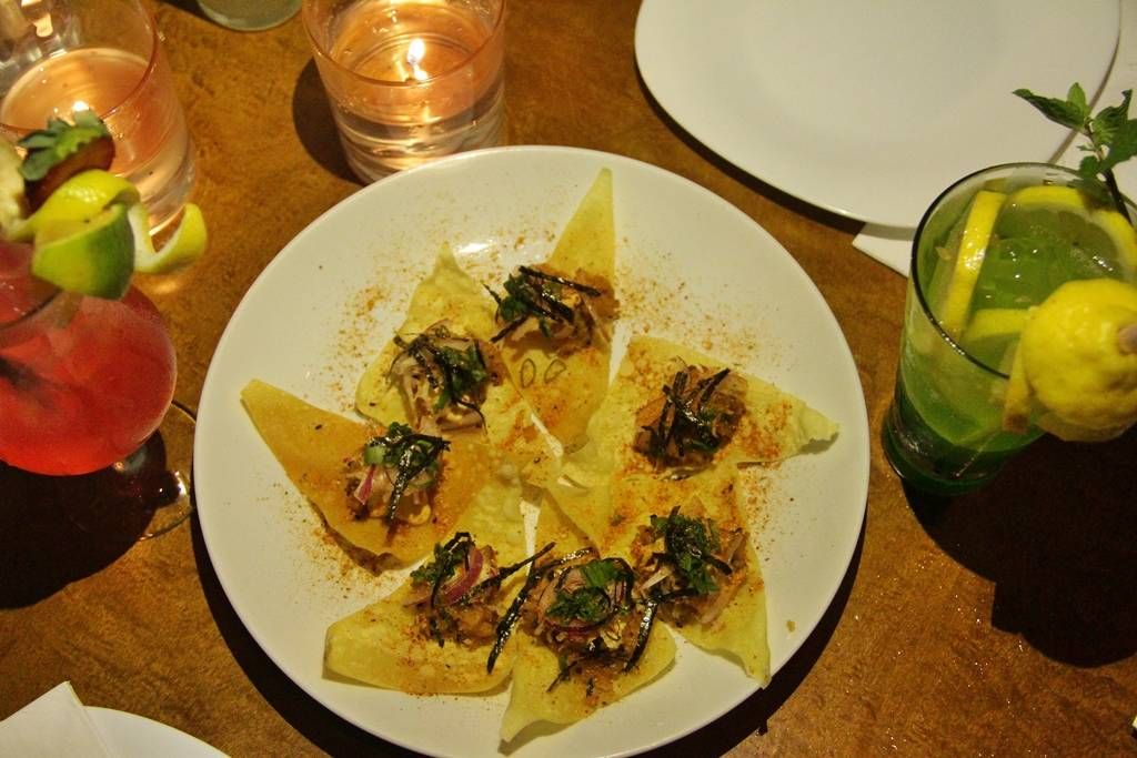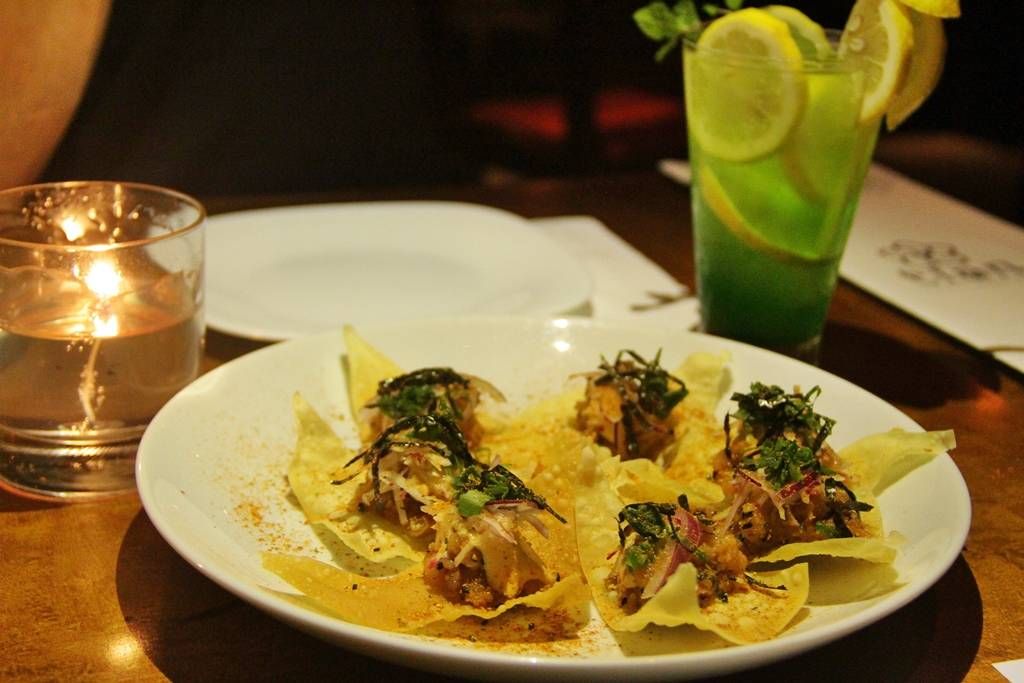 Bom, provamos várias comidinhas ótimas lá no Tian. Começamos com o Tuna Nachos. São chips de massa wonton que vem com um tartar de atum bem temperadinho em cima. Para completar, o molho cremoso com chipotle. Para quem não sabe, chipotle é uma pimenta. Dos pratos apimentados da casa, esse é o mais tranquilo de comer, mas já aviso que estava beeem apimentado. A combinação de nacho com atum e com pimenta, parece loucura, mas vai por mim, você vai querer comer mais. Estava delicioso!