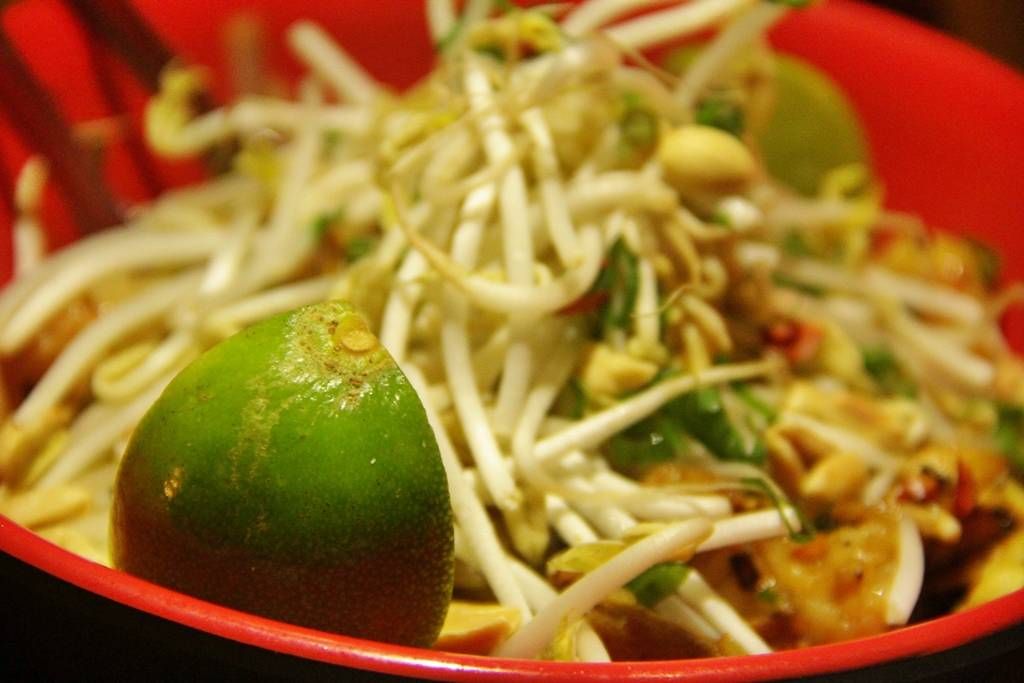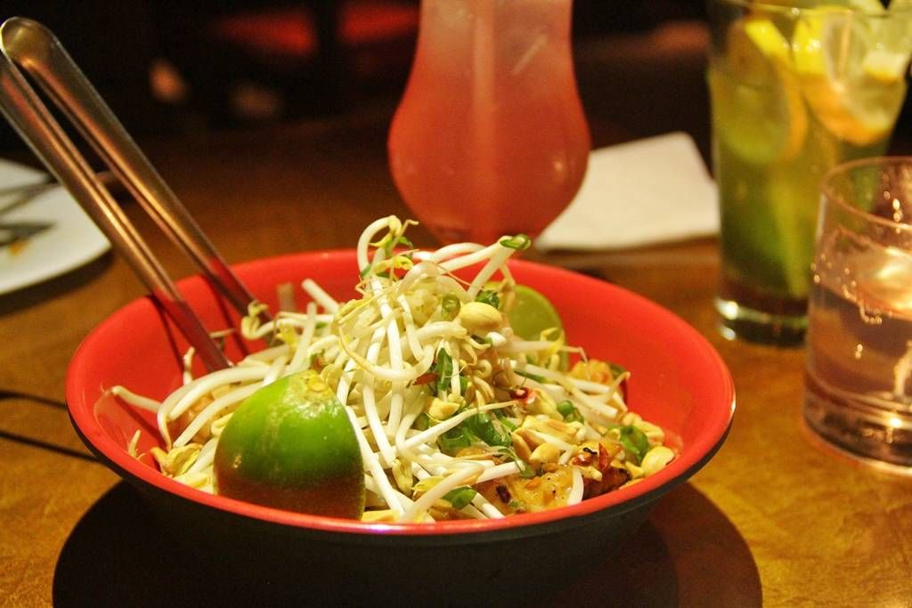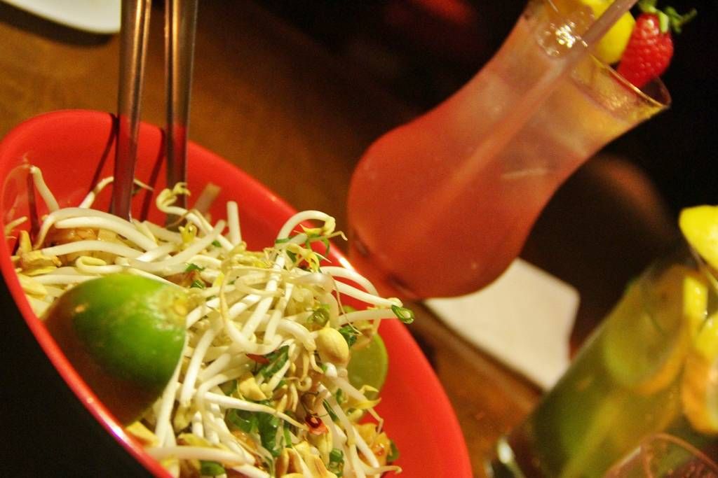 E então, decidimos pedir um dos pratos mais famosos da casa (se não for o mais famoso) e que já ganhou vários prêmios. O Pad Thai. Os ingredientes desse prato são: macarrão de arroz tailandês, camarão, frango, broto de feijão, tamarindo, limão, cebolinha nirá e amendoim. Parece uma zona, né?! É uma zona de ingredientes na verdade, mas o que as pessoas não se atentam, é que é uma zona totalmente bem pensada e bem escolhida.