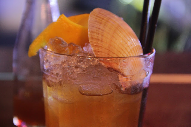 O segundo drink do Leo era o Mensagem na Garrafa. Mais uma vez, que drink criativo! Olha a apresentação dele com essa concha enorme de linda bem na nossa cara. Ele levava Rum Kraken, Johnnie Walker Double Black (nhaaam), mix de Vermute Trabuca, cajuína, laranja e angostura. Que mistura dos deuses. Eu adorei. O líquido vinha nessa garrafinha para a gente abrir a “mensagem” e jogar no copo cheio de gelo decorado com essa concha. Não é demais? Eu fiquei apaixonada!