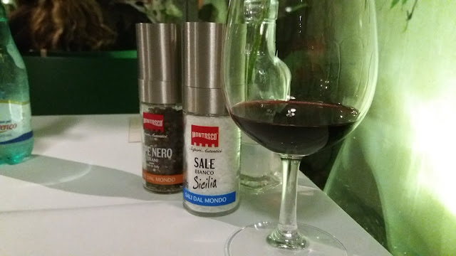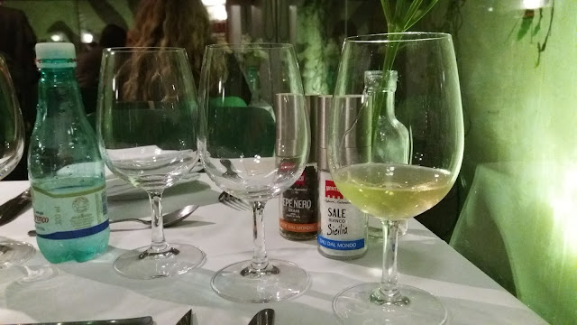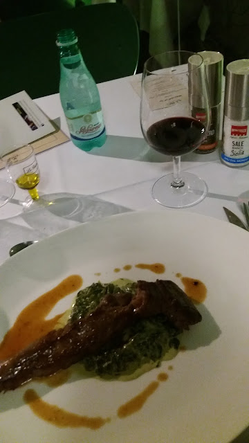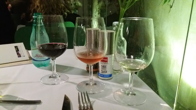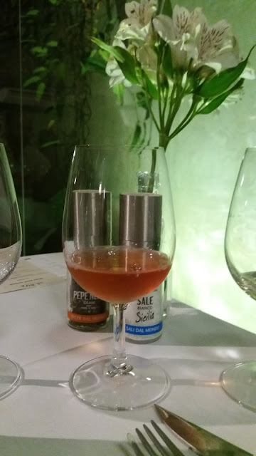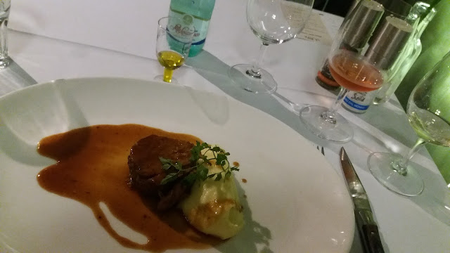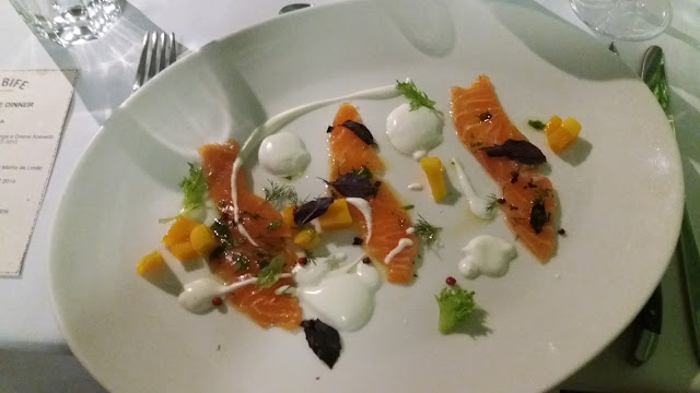 De entrada, foi servido um Salmão Marinado com Ricard, Manga e um Creme Azedo. para harmonizar, um vinho branco Albarino da safra de 2015. Eu não conhecia essa uva, nunca havia provado. Amei, é um vinho fresco e frutado. Mas eu, particularmente, não curto muito a combinação entre vinho branco e salmão, por isso achei que não harmonizou muito bem. Mas ambos, separadamente, são fantásticos. Vinho maravilhoso e o prato estava dos deuses.