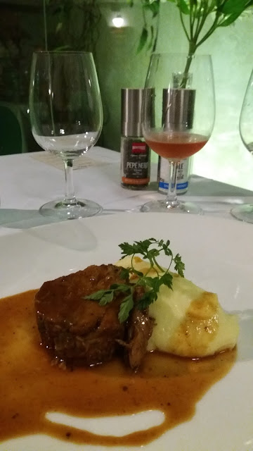 O primeiro prato principal foi um Pernil de Vitela com Purê de Batata e Molho de Limão Siciliano. Para acompanhar, um vinho rosé Pinot Noir de safra 2014. Essa harmonização foi maraaaavilhosa. Eu amei a carne leve da vitela com o sabor igualmente leve do Pinot Noir Rosé. O purê estava no ponto certo, também leve e o molho deu o toque final. Tudo muito bom. Foi o prato que eu mais gostei! (Tenho uma queda absurda por vinhos roses, então acho que isso influenciou hehehe).