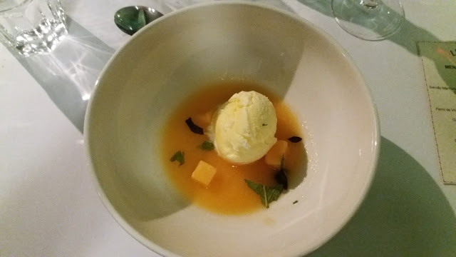 Por fim, uma sobremesa super fresca e docinha que foi uma Sopa de Melão com Sorvete de Baunilha. Simples, mas muito bem feita e saborosa. Foi feita com aqueles melões cor de laranja bem doces. Comi muito disso na França, então bateu uma saudade.